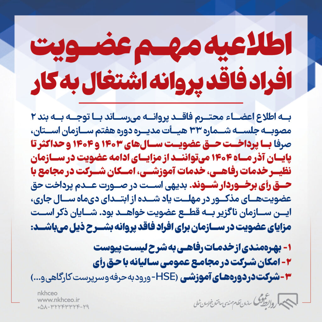 به اطلاع اعضاء محترم فاقد پروانه میرساند با توجه به بند ۲ مصوبه جلسه شماره ۳۳ هیأت مدیره دوره هفتم سازمان استان، صرفا با پرداخت حق عضویت سالهای ۱۴۰۳ و ۱۴۰۴ و حداکثر تا پایان آذر ماه ۱۴۰۴ میتوانند از مزایای ادامه عضویت در سازمان نظیر خدمات رفاهی، خدمات آموزشی، امکان شرکت در مجامع با حق رأی برخوردار شوند. بدیهی است در صورت عدم پرداخت حق عضویتهای مذکور در مهلت یاد شده از ابتدای دیماه سال جاری، این سازمان ناگزیر به قطع عضویت خواهد بود. شایان ذکر است