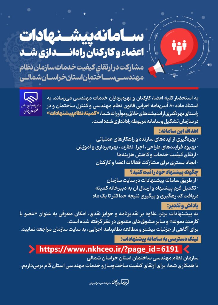 به استحضار کلیه اعضا، کارکنان و بهرهبرداران خدمات مهندسی میرساند، به استناد ماده ۸۰ آییننامه اجرایی قانون نظام مهندسی و کنترل ساختمان و در راستای بهرهگیری از اندیشههای خلاق و نوآورانه شما، «کمیته نظام پیشنهادات» در سازمان تشکیل و سامانه مربوطه راهاندازی شده است.