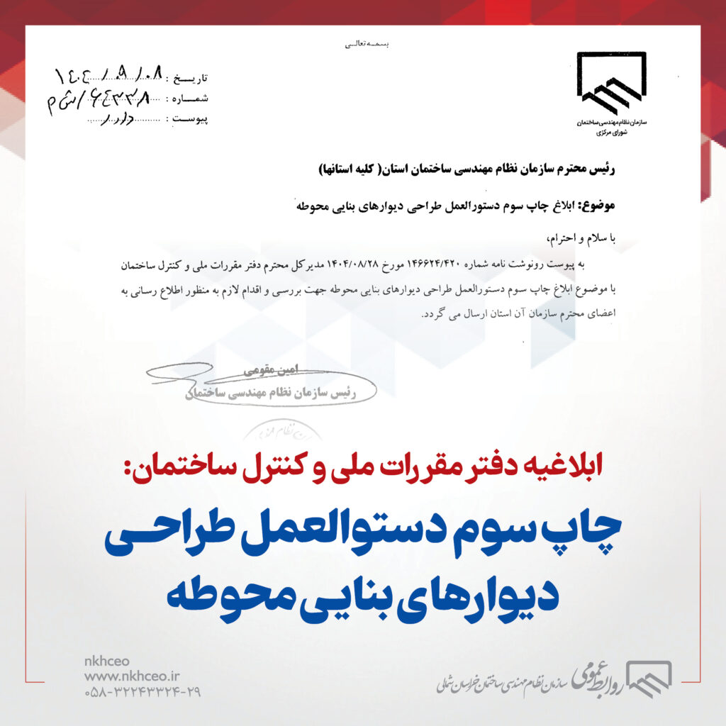 به اطلاع مهندسین محترم میرساند با توجه به ابلاغیه دفتر مقررات ملی و کنترل ساختمان در خصوص دستورالعمل طراحی و اجرای دیوارهای بنایی محوطه، ویرایش سوم ضوابط مذکور تهیه و رعایت مفاد این ویرایش برای ساختمانهایی که دستور تهیه نقشه آنها یکماه پس از تاریخ این ابلاغ به بعد صادر میشود الزامی است و آز آن تاریخ به بعد ویرایش پیشین فاقد اعتبار خواهد بود.