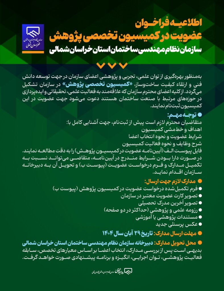 بهمنظور بهرهگیری از توان علمی، تجربی و پژوهشی اعضای سازمان در جهت توسعه دانش فنی و ارتقاء کیفیت ساختوساز، «کمیسیون تخصصی پژوهش» در سازمان تشکیل میگردد. از کلیه اعضای محترم سازمان که علاقهمند به فعالیت علمی، تحقیقاتی و ایدهپردازی در حوزههای مرتبط با صنعت ساختمان هستند دعوت میشود جهت عضویت در این کمیسیون ثبتنام نمایند.