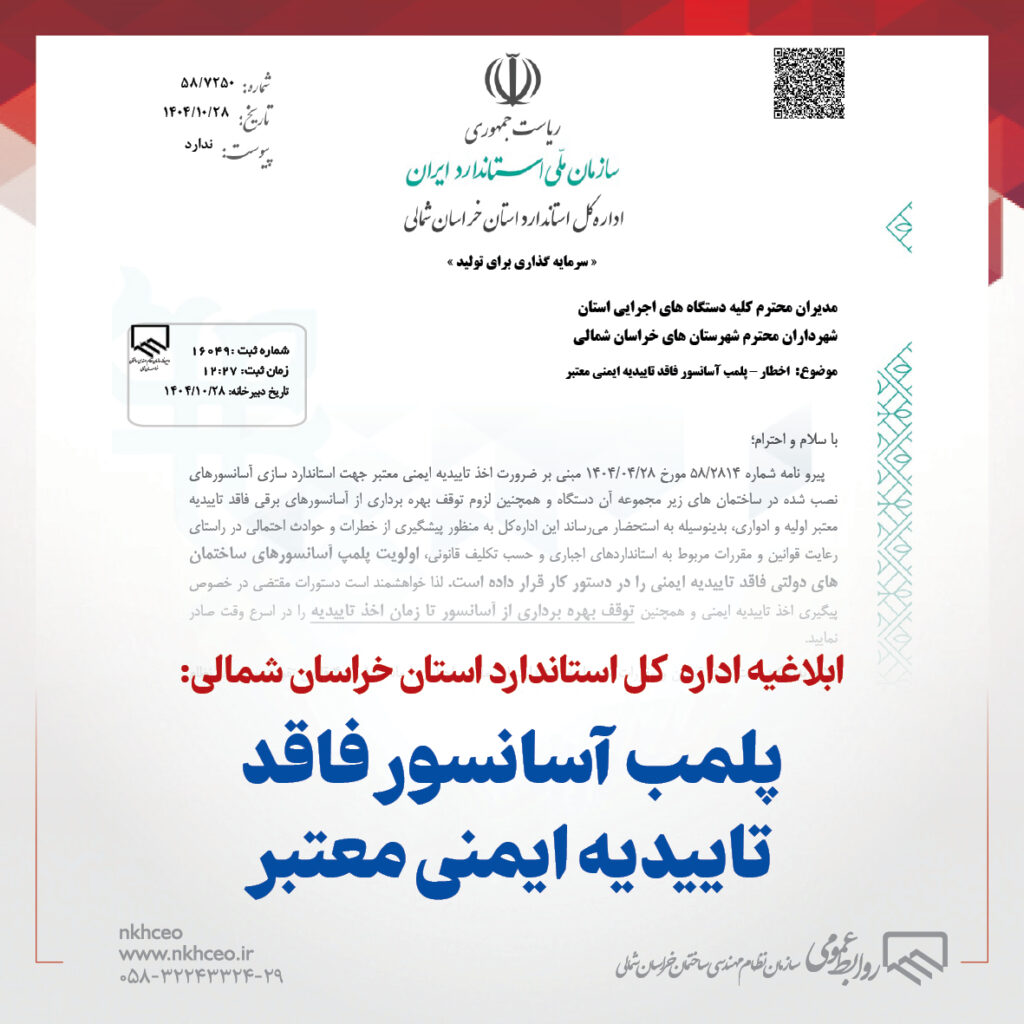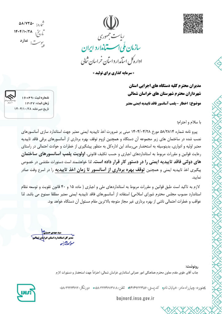 ابلاغیه اداره کل استاندارد استان خراسان شمالی: پلمب آسانسور فاقدتاییدیه ایمنی معتبر